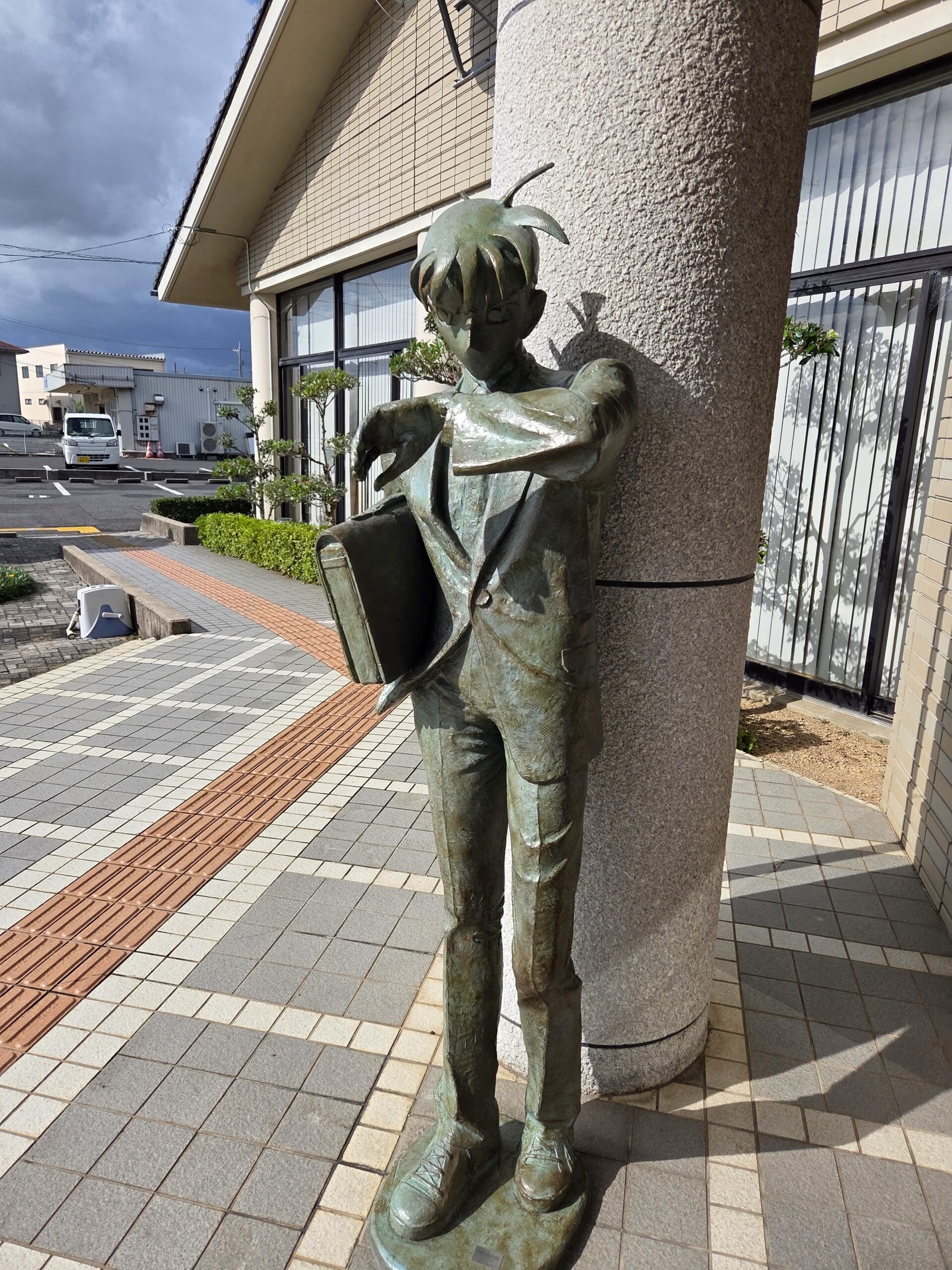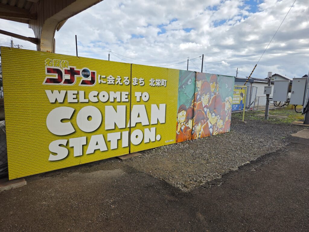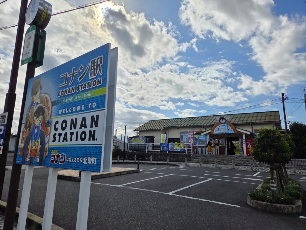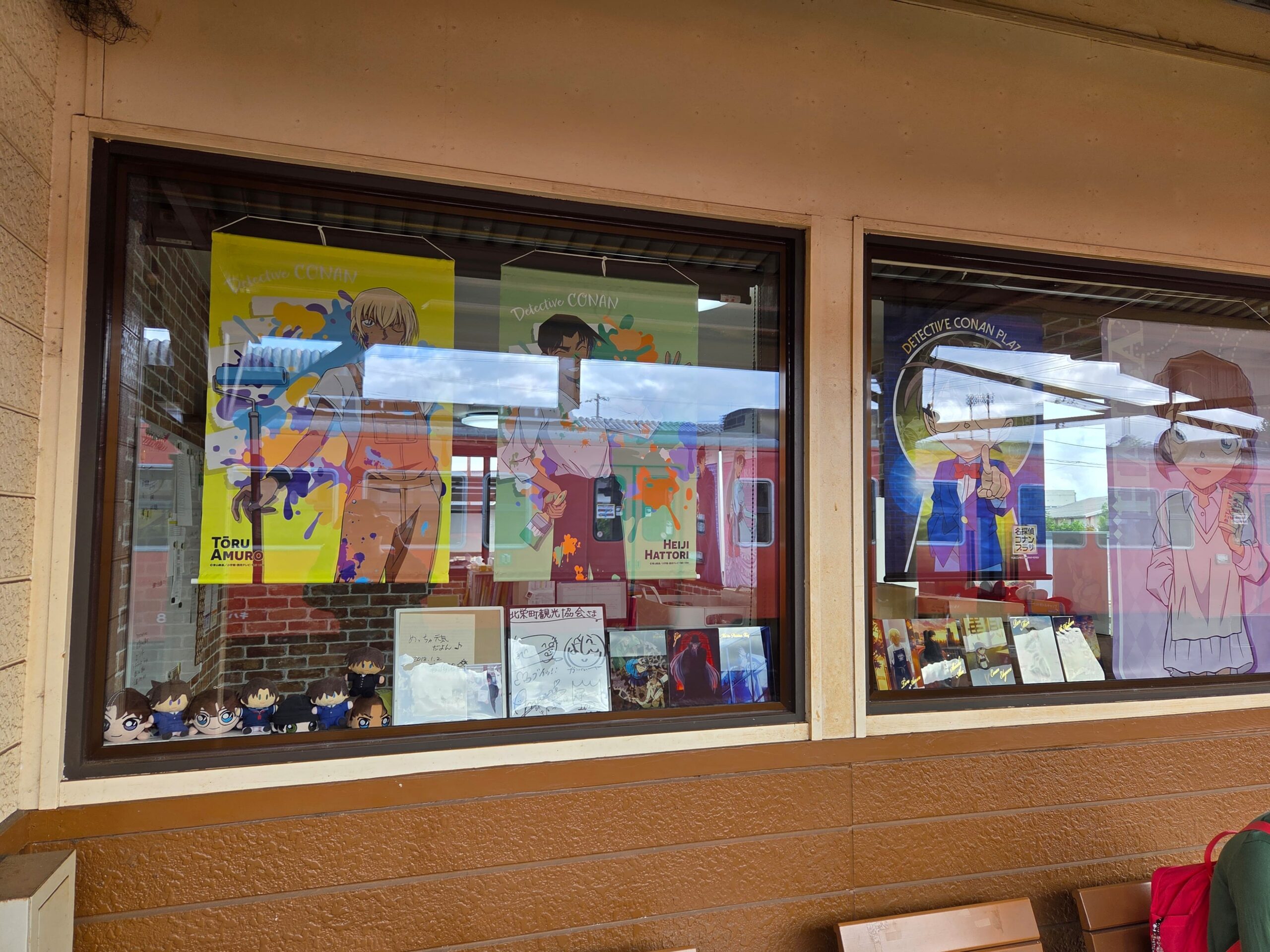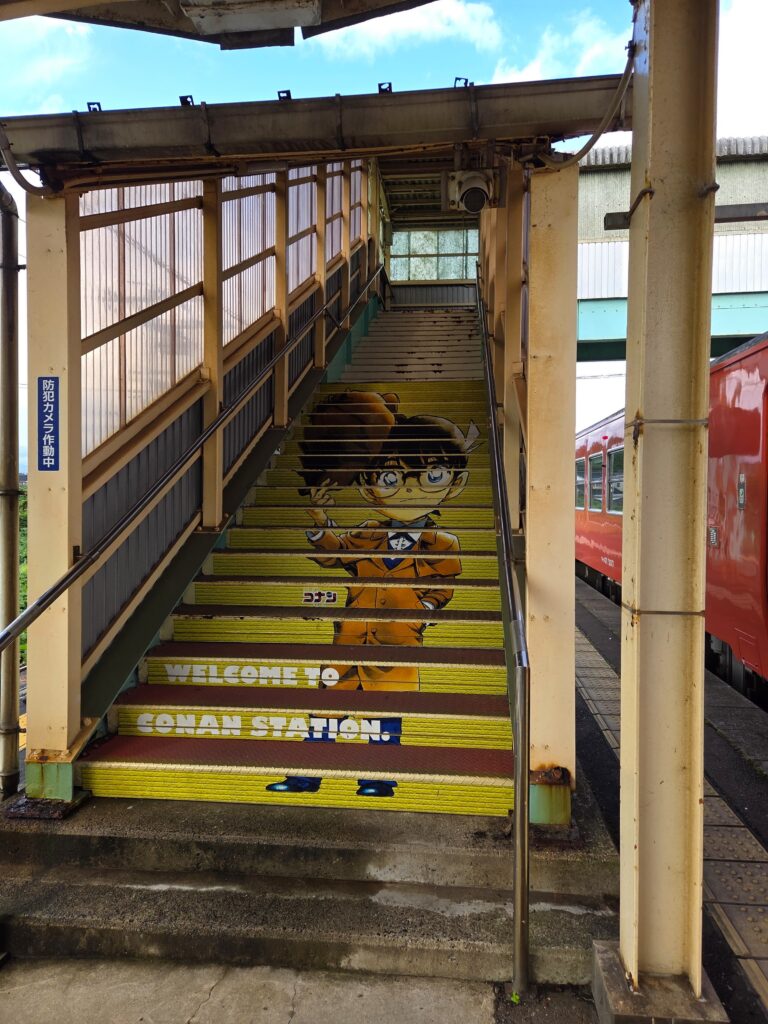 When reaching Hokuei’s ‘Yura Station’ or dubbed as “Conan Station”, the whole station is Conan-themed! From the stairs, posters, windows, everything is Conan-themed. Right outside the station, there are several more Conan-themed attractions, like statues and posters.